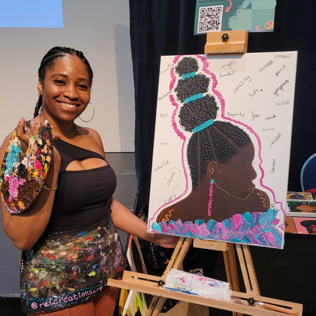 Reisha Felix is a fine arts artist in Toronto who was born and raised on the Caribbean island of Dominica. Her art practice (ReiCreations Art) celebrates the treasures of her Afro-Caribbean culture and her lived experiences on canvas – she is particularly interested in highlighting the treasure of Black hair and creating positive hair experiences through artistic expression. She is self-taught and primarily uses acrylic paints and hot glue to create textured artworks.